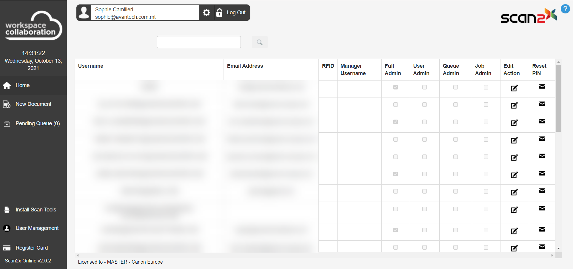Here, an administrator can search for users, edit action, and reset their PIN.