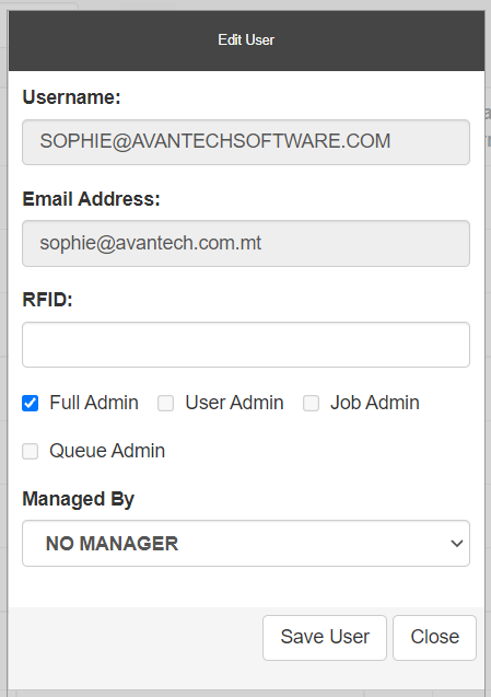 Once the Edit Action button is clicked, the following screen will appear. This allows the administrator to enter a card RFID number, choose a type of Admin, and assign a manager to that particular user.
