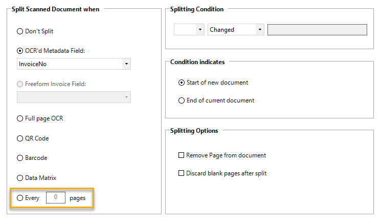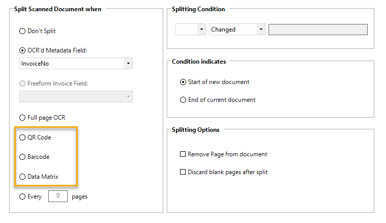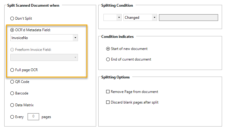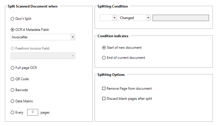It is possible to split documents based upon the presence or otherwise of text on a page. This text can be printed (i.e., human readable) or in the form of a 1D barcode or 2D barcode (e.g., QR codes, data matrix codes). Select this option if the text that the document is to be split by is in a constant or predictable position on the page. Within the metadata tab, create a metadata field to hold the text and an OCR zone that will populate this field. Then select it in the OCR’d Metadata Field dropdown below and use a splitting condition to trigger a document split. The Freeform Invoice Field option has the same functionality as the OCR'd Metadata Field option, but instead uses the Freeform Invoice Services to OCR the document. For more information, please refer to the Freeform Invoice Services Tab in the Scan2x Administration Guide.