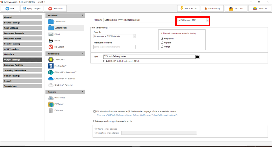 Scan Jobs are defined in Scan2x with one destination. In cases where a scanned document is required to be sent to multiple destinations, Scan2x allows for the creation of Workflows, in which the output from one Scan Job can be used as the input for another job, or even used as data upon which to take a routing decision. More details can be found in the Administrator’s Guide under Job Workflows.