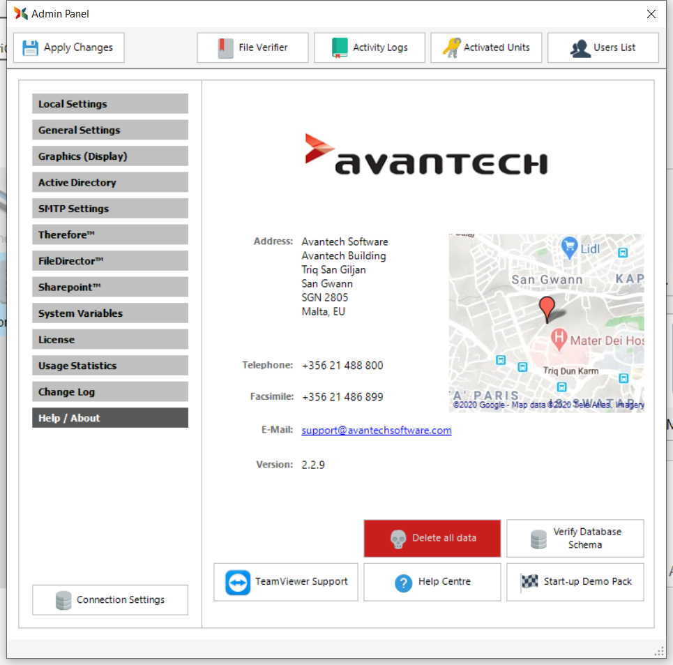 The Help screen is in the admin module and is accessed by tapping or clicking on the Help/About option on the left-hand side of the module. See screenshot below.