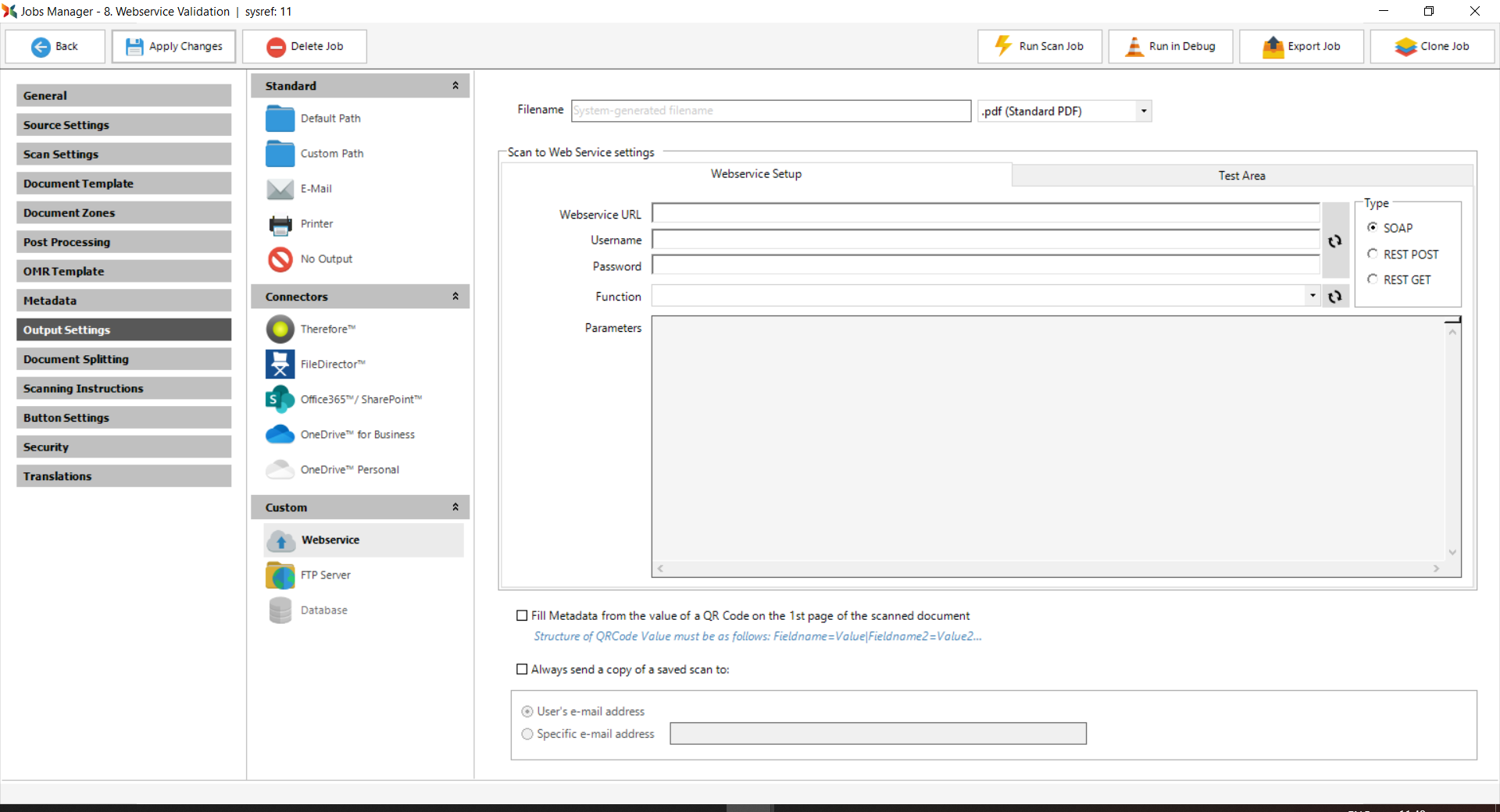 Global variables are persisted across all devices in the Scan2x network, and are used as in the following example: If the organization has external systems (e.g., a CRM or an HR system) that the Scan2x network is communicating with in some way, we can store the IP addresses for each system server as a global variable – see screenshot above. These variables can then be used within jobs, accessed when defining metadata by using the “open square bracket” character to enable the dropdown as in the screenshot below.