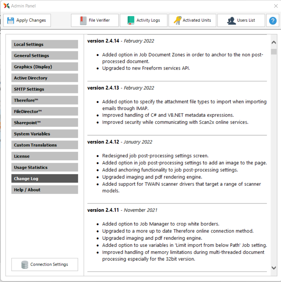 Use the Change Log Tab to view the latest updates that have taken place to Scan2x system.