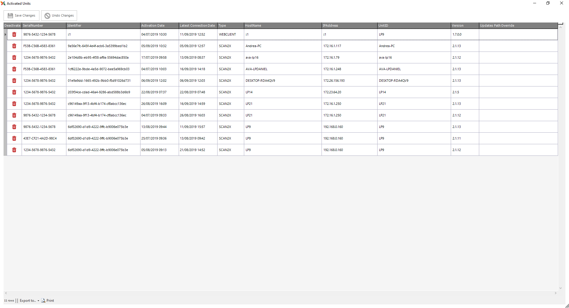 Activated Units tab provides administrators with a list of all Scan2x licences that have logged on to the network, together with their serial numbers.