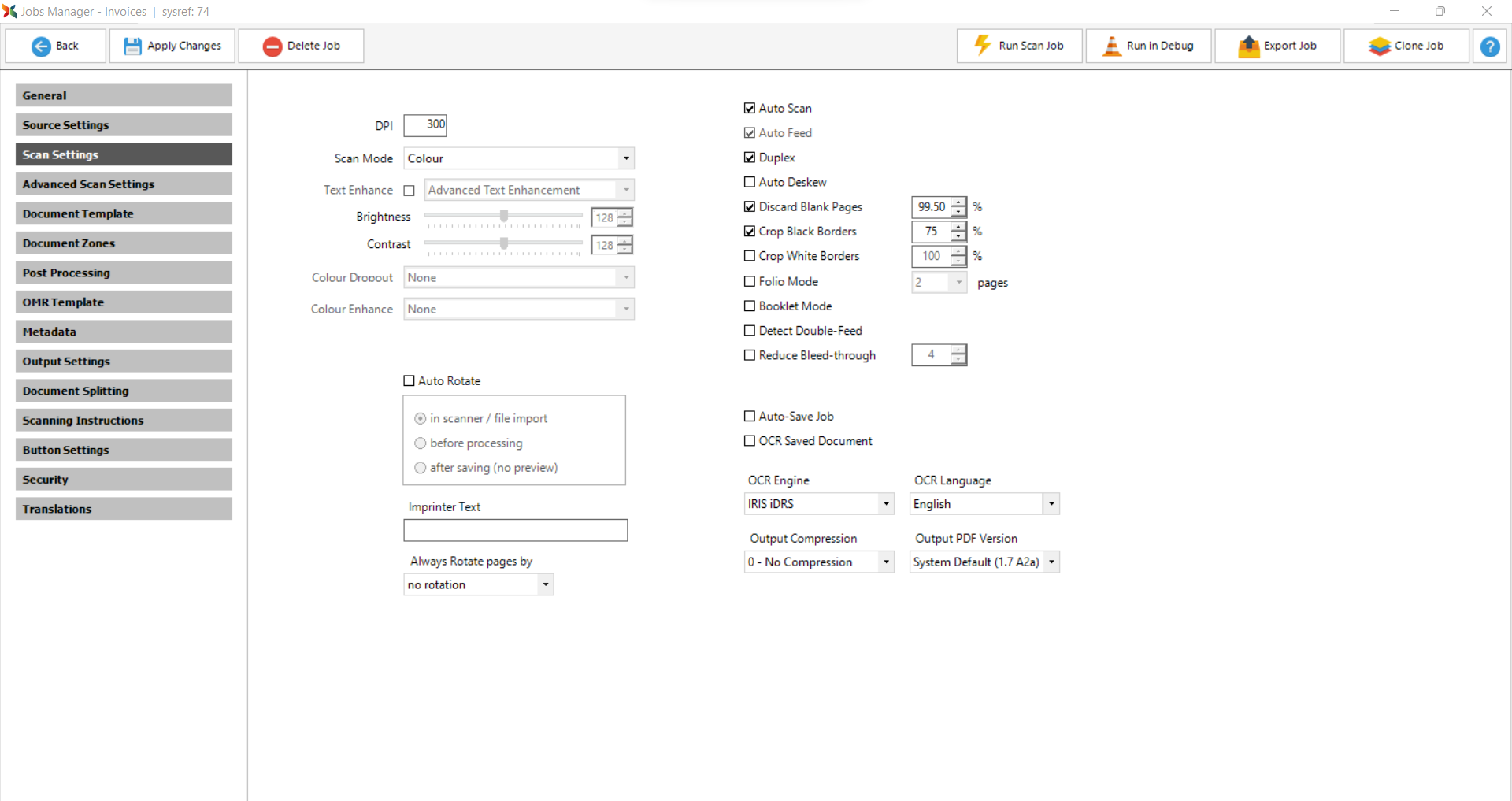 To set the scan resolution for this job, enter the DPI required into the DPI text box. Use the Scan Mode drop down to select between colour, grayscale or black and white (binary) scans. In addition, there may also be additional proprietary modes in there related to scanner models.