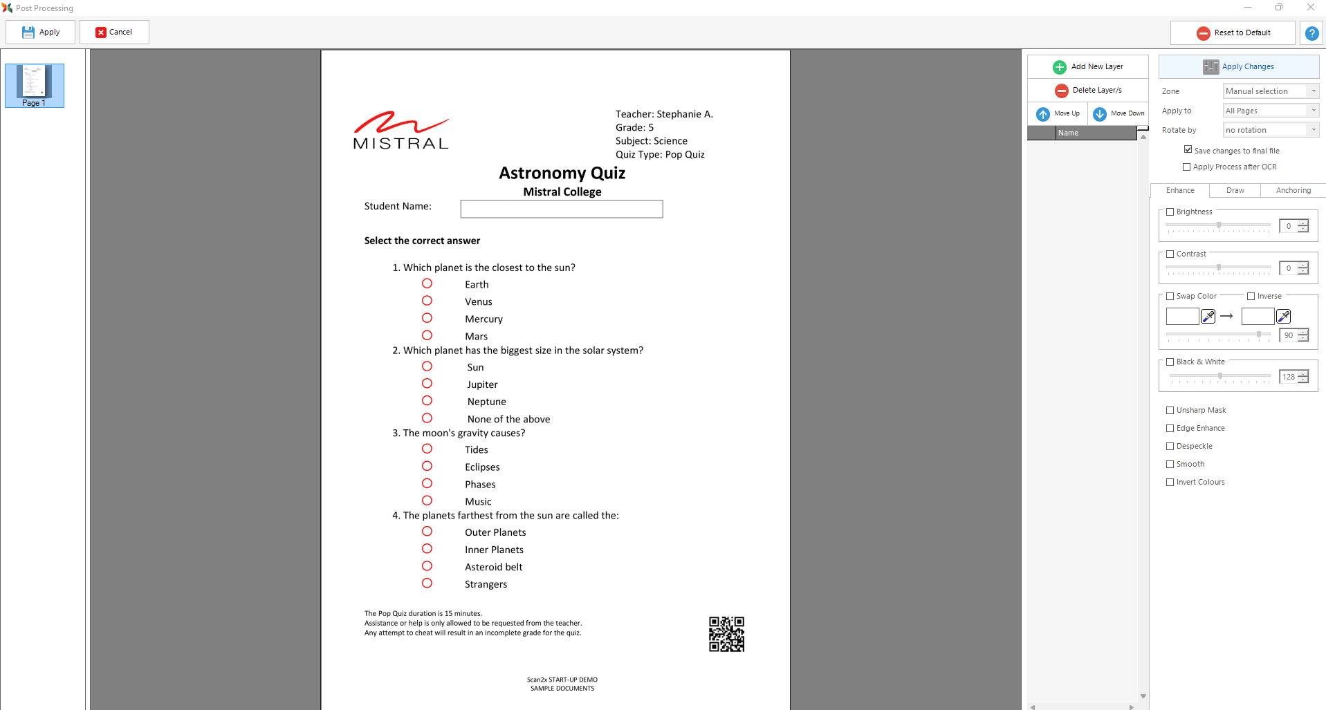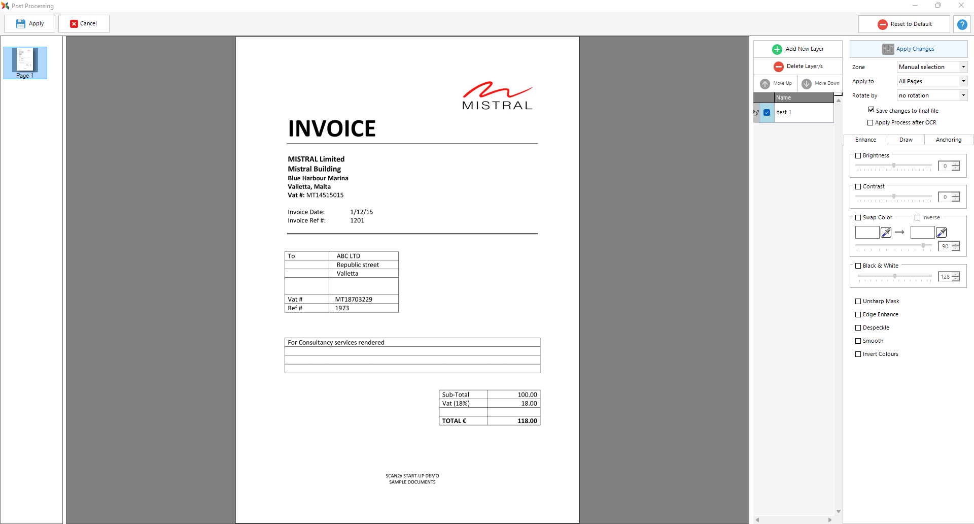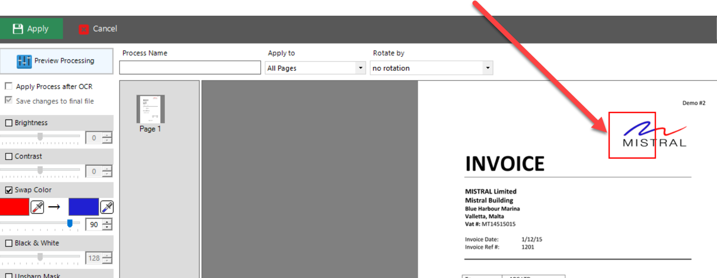 Rules can be defined to change or enhance the image received from the scanner, and you can choose as to whether the changes are used only during the OCR process (i.e., not saved with the final document in its final destination) or persisted through with the document to its final destination. To illustrate, consider the following examples: