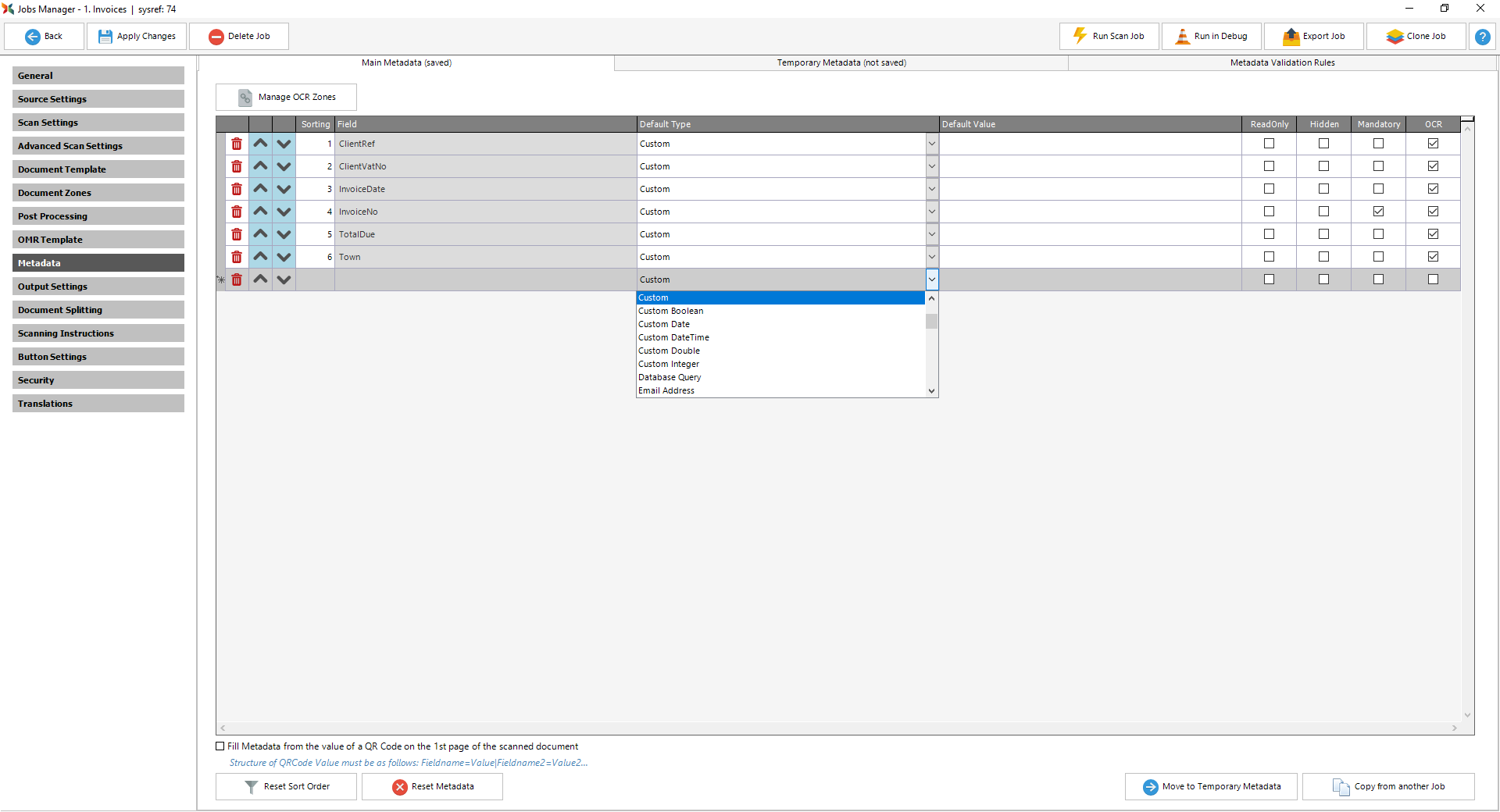 The Metadata tab is where the metadata for documents to be scanned by this job is defined.