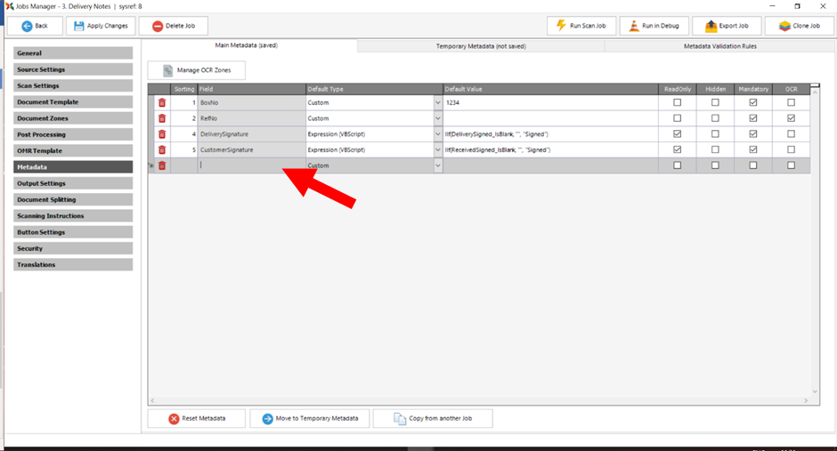 Sets up the metadata field to receive data in tabular format – e.g., for invoice line item capture. Only available in the full version of Scan2x.