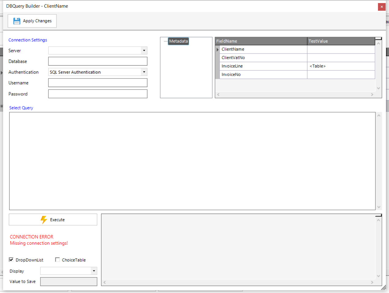 On setting a metadata field to type Database Query, the DB Query Builder button appears above the metadata field definition grid, as shown below.