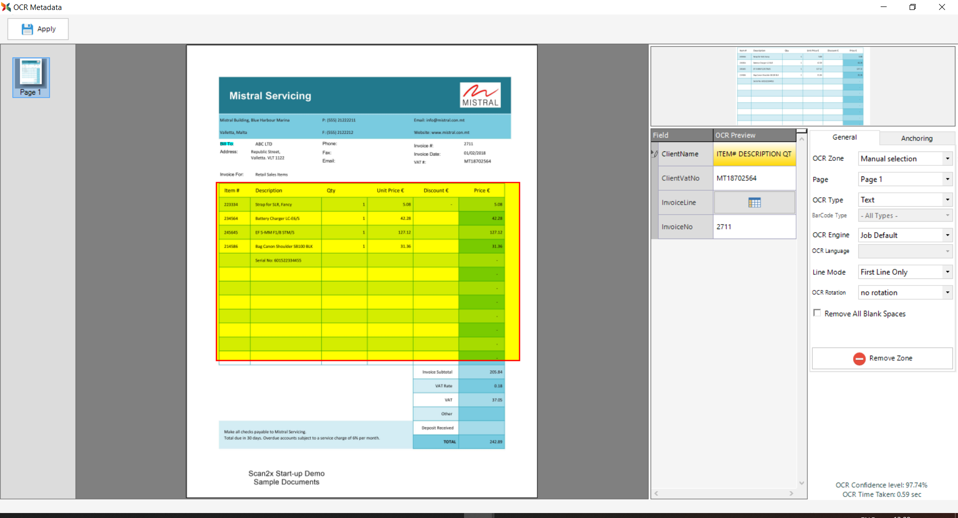 In Scan2x, it is possible to define the OCR functionality of a metadata field as Table or Table With Headers – for more information on how to do this, please see the OCR Zones best practices Tab.