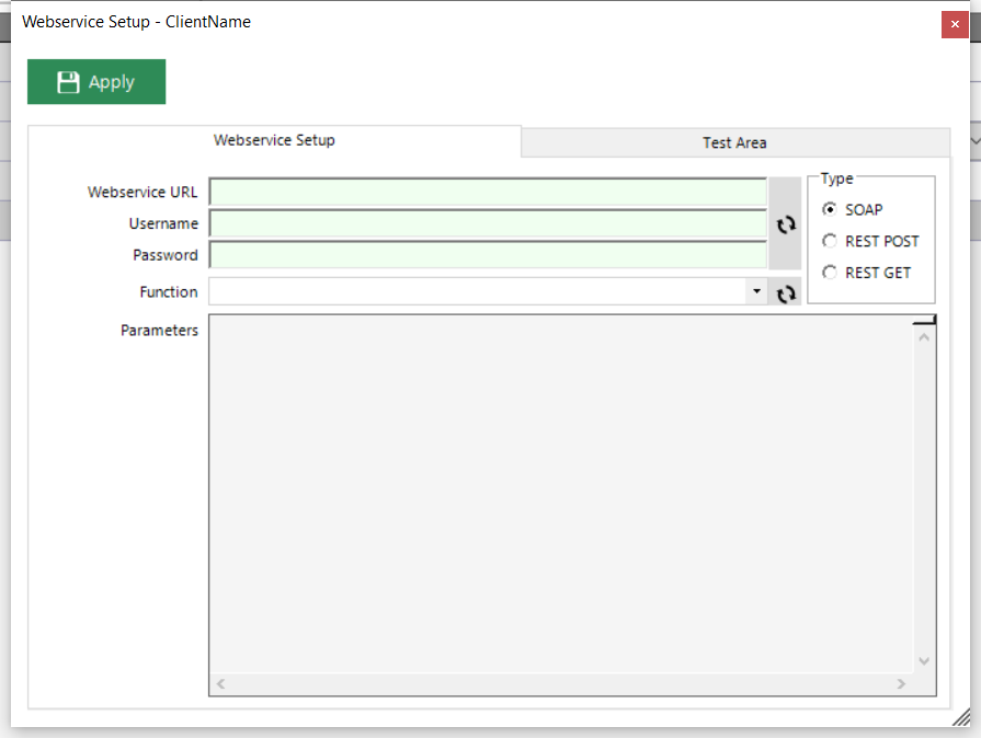 In the Webservice Setup tab, type the webservice URL, access username and password into the appropriate fields for the webservice you wish Scan2x to access.