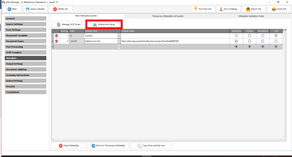 The Web Service Setup button is visible when a metadata field that has been defined as a Web Service Call is selected, as highlighted in the red box in the screenshot below.